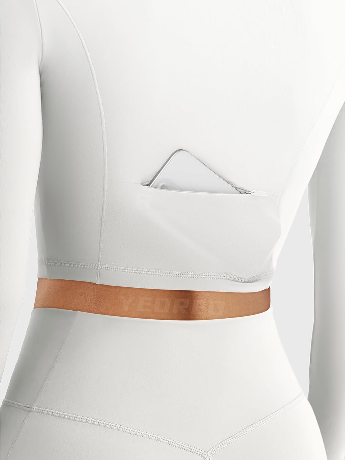 - DESIGN: Mock neck with half zip up design, cropped length with thrumb hole, back pocket and exposed contour stitching without padded.